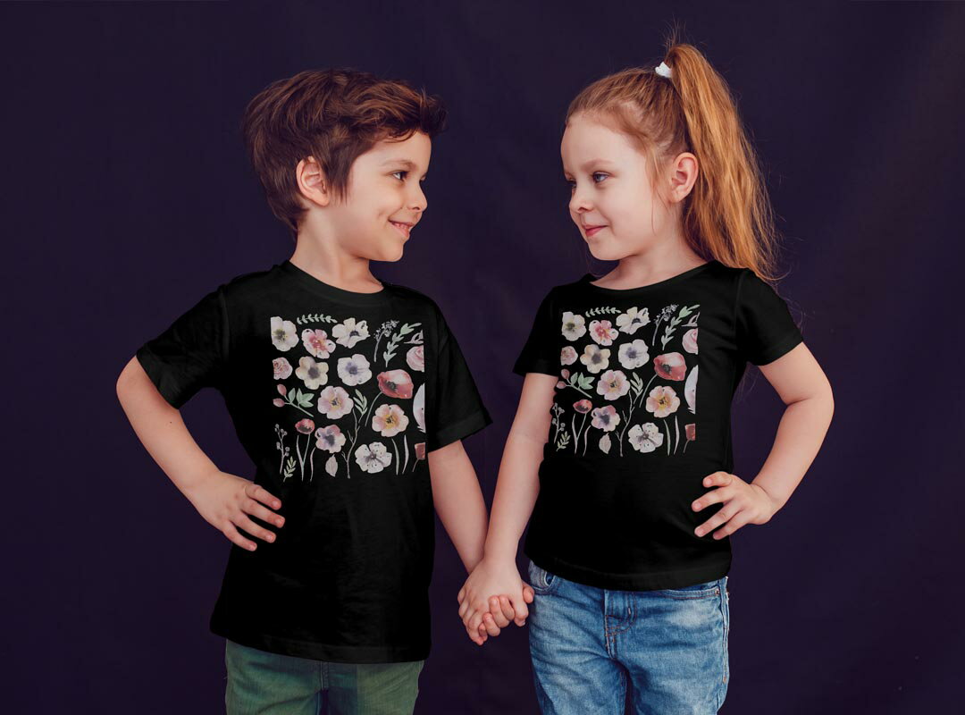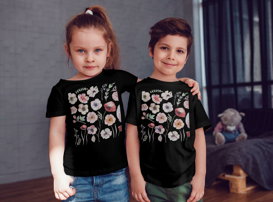 tシャツ キッズ 半袖 黒地 ブラック デザイン 90 100 110 120 130 140 150 Tシャツ ティーシャツ T shirt 013493 花 花柄 水彩
